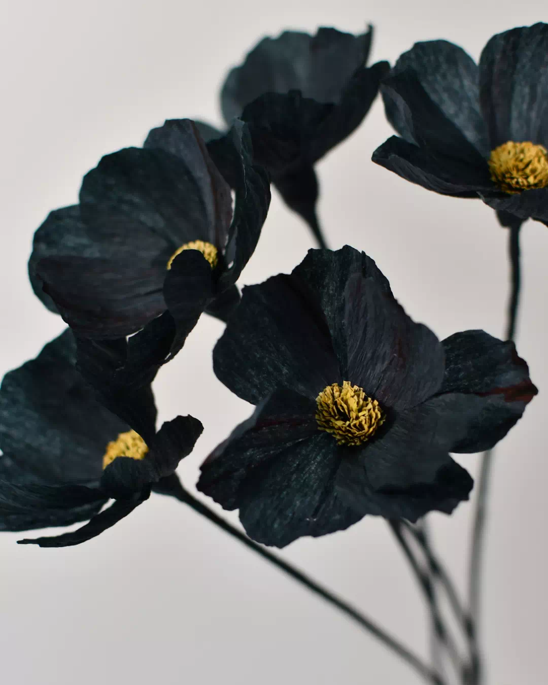 Chaque fleur est façonnée à la main à partir de papier crépon italien ou européen. Je colore souvent le papier à l’aquarelle pour obtenir des nuances uniques, et parfois je choisis de travailler la teinte brute du crépon.
