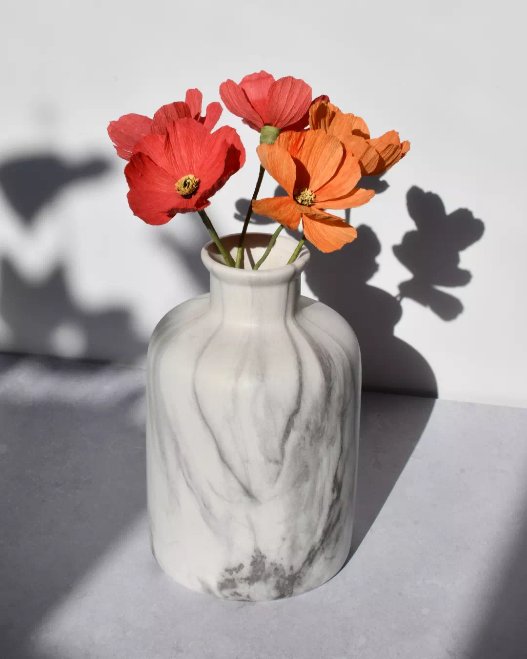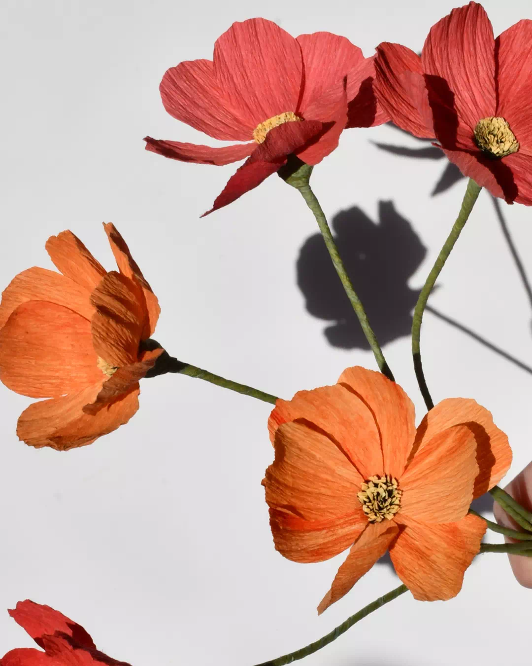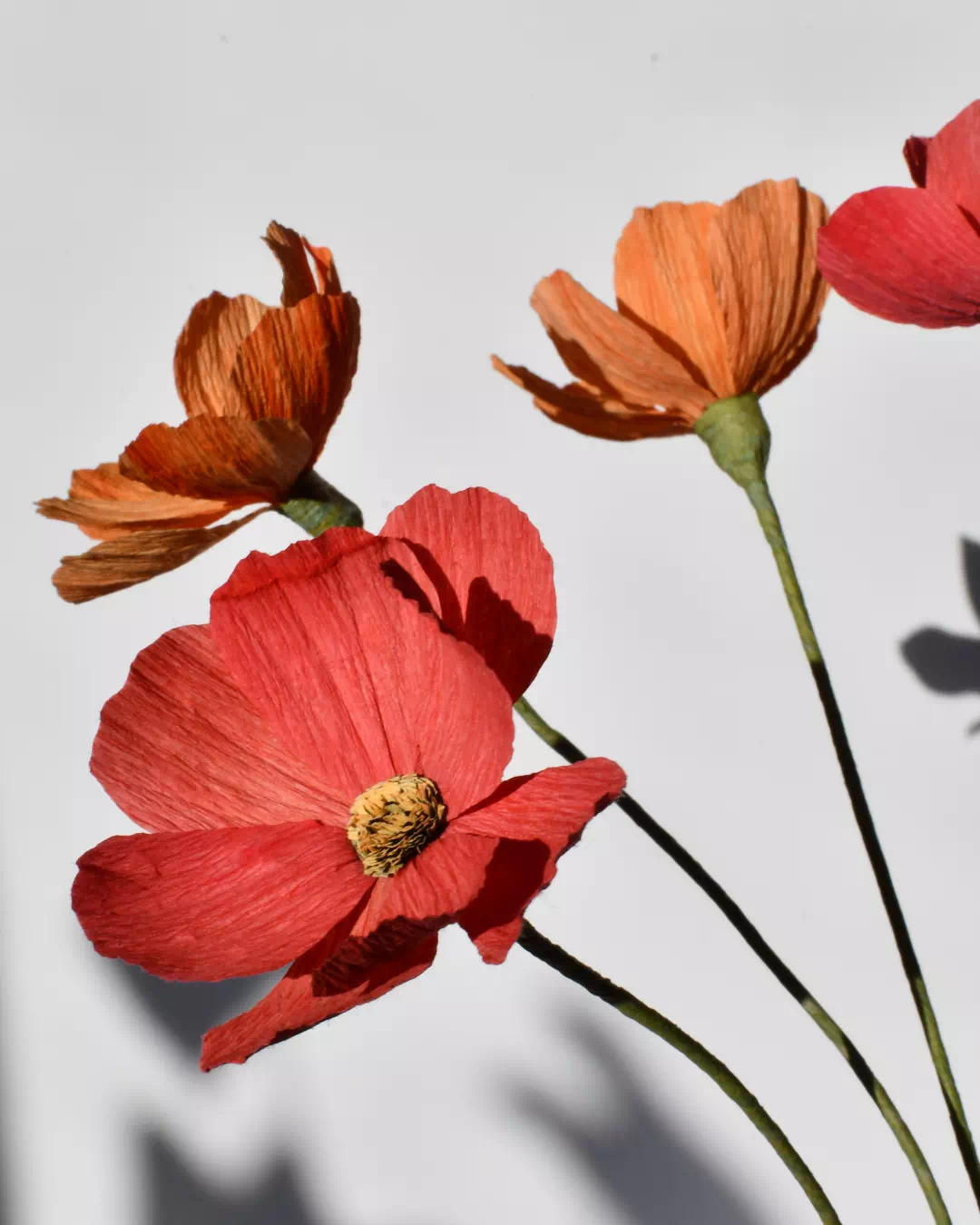 Chaque fleur est façonnée à la main à partir de papier crépon italien ou européen. Je colore souvent le papier à l’aquarelle pour obtenir des nuances uniques, et parfois je choisis de travailler la teinte brute du crépon.