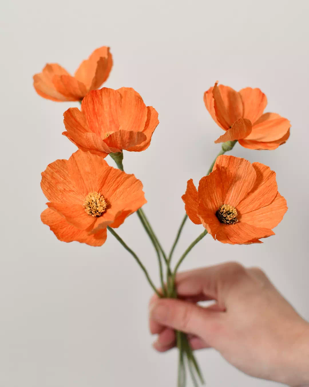 Chaque fleur est façonnée à la main à partir de papier crépon italien ou européen. Je colore souvent le papier à l’aquarelle pour obtenir des nuances uniques, et parfois je choisis de travailler la teinte brute du crépon.