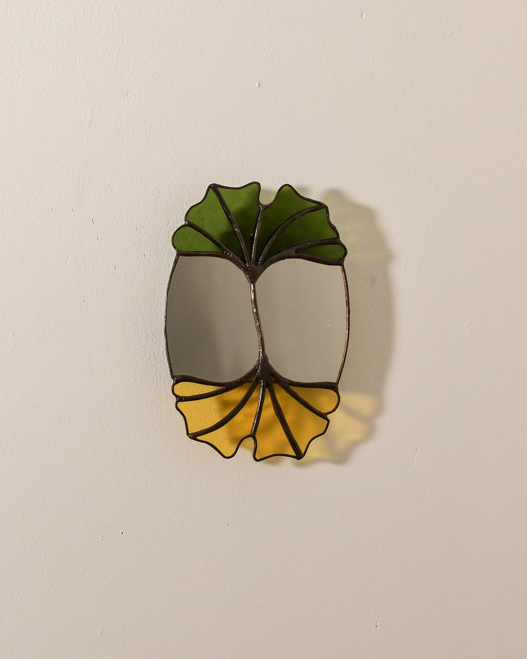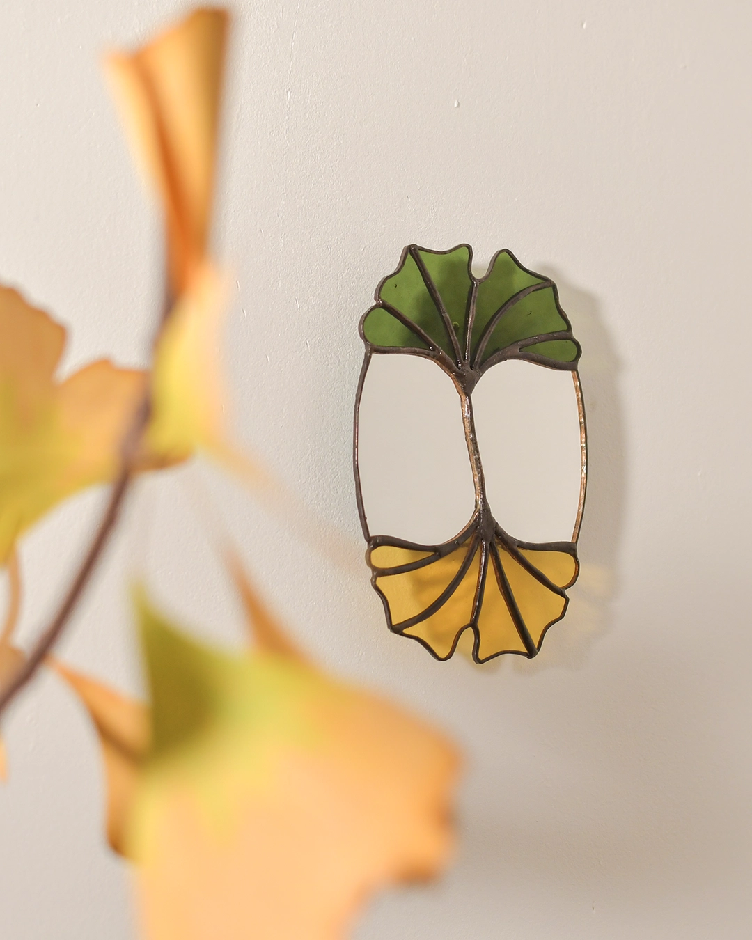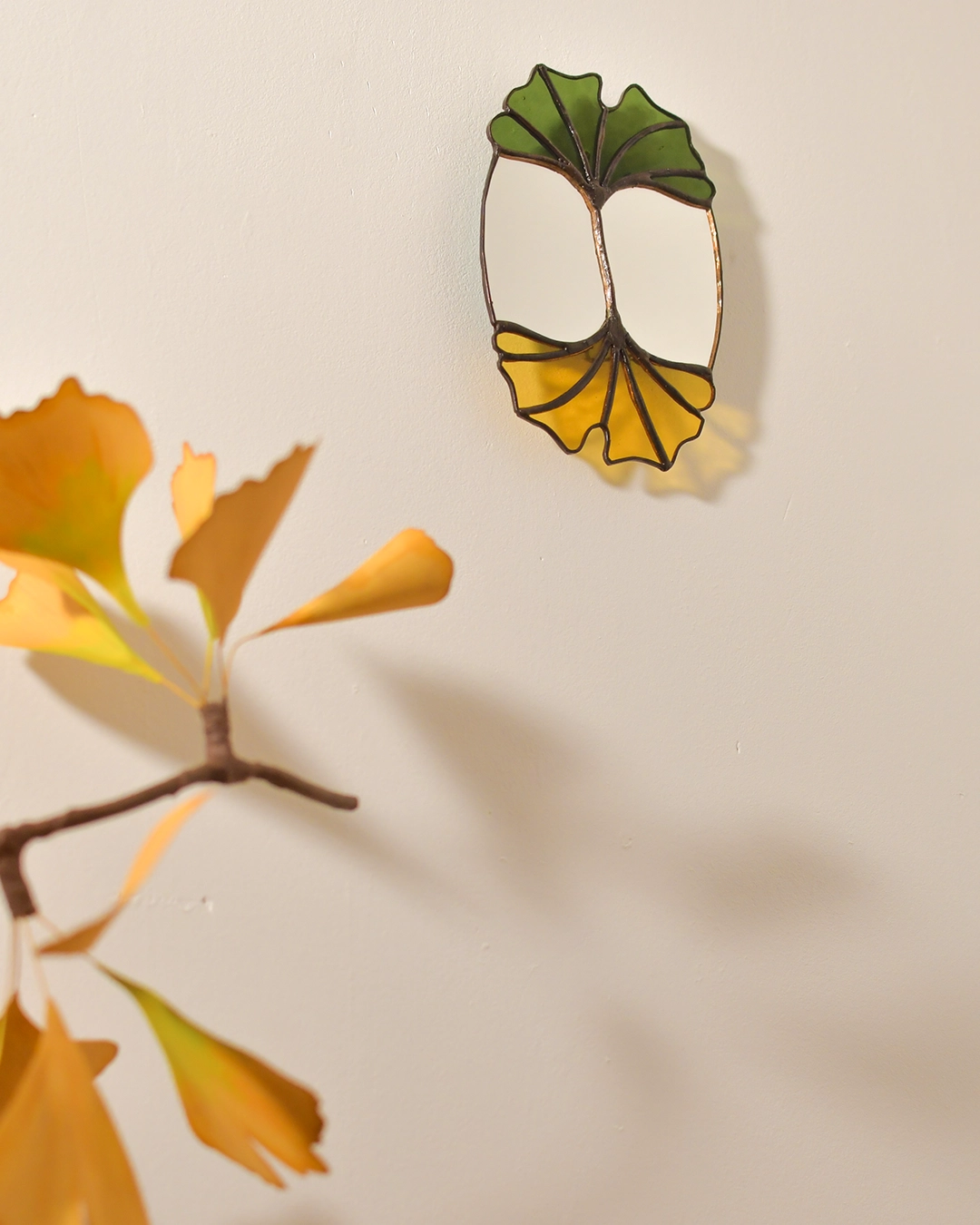 Le vitrail m’a inspiré une illustration en aquarelle autour du Ginkgo Biloba qui est fournie avec ce miroir comme une extension du thème.