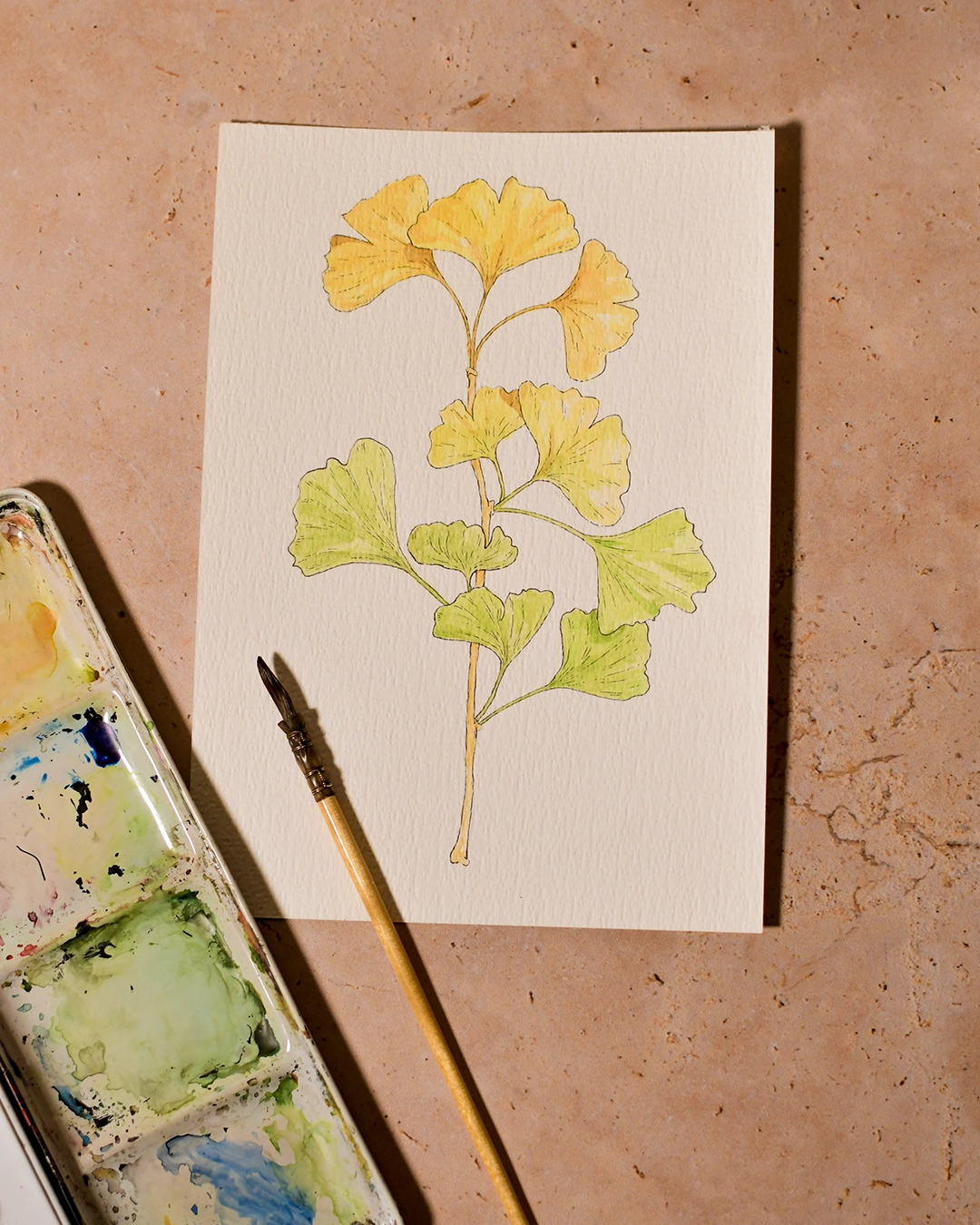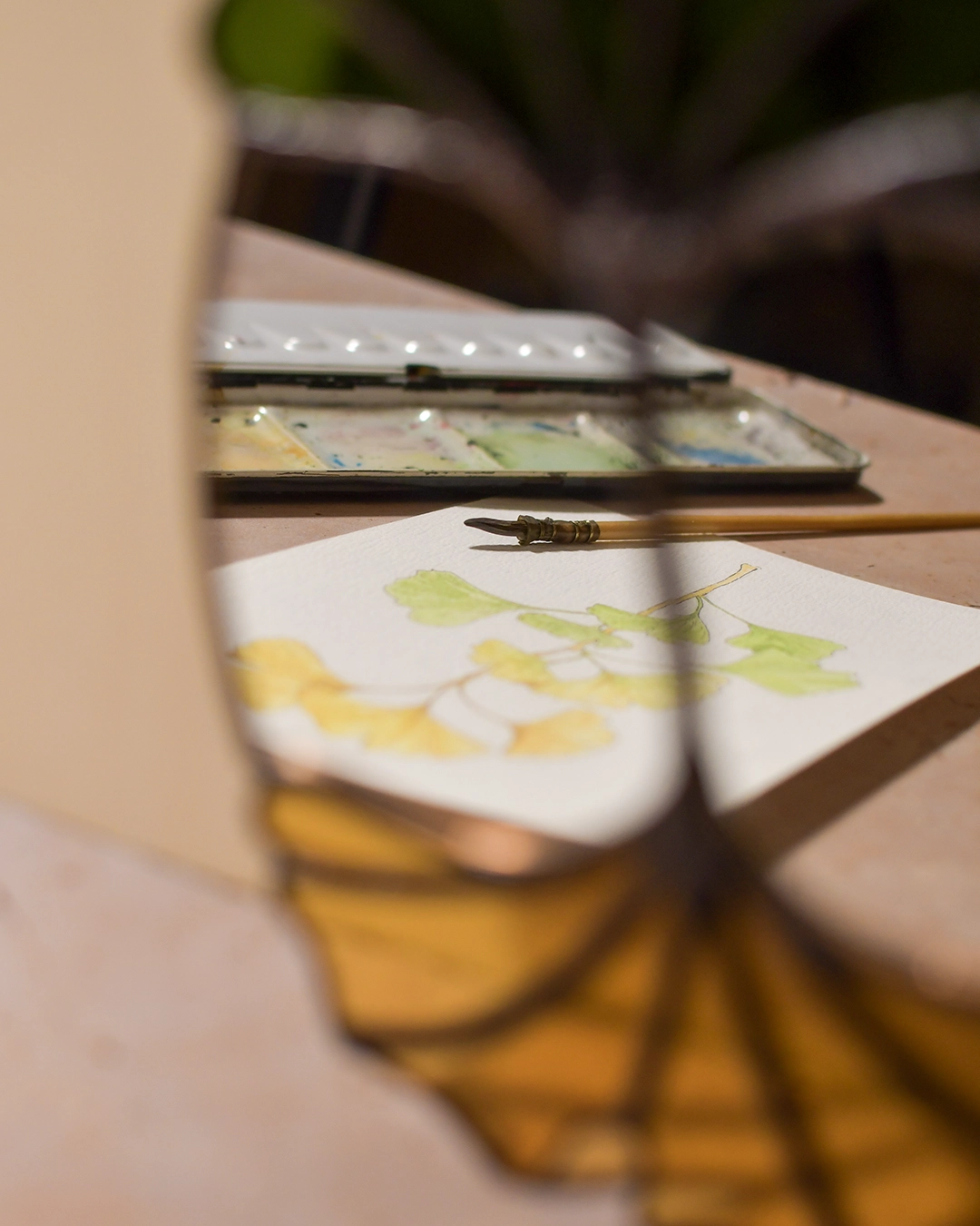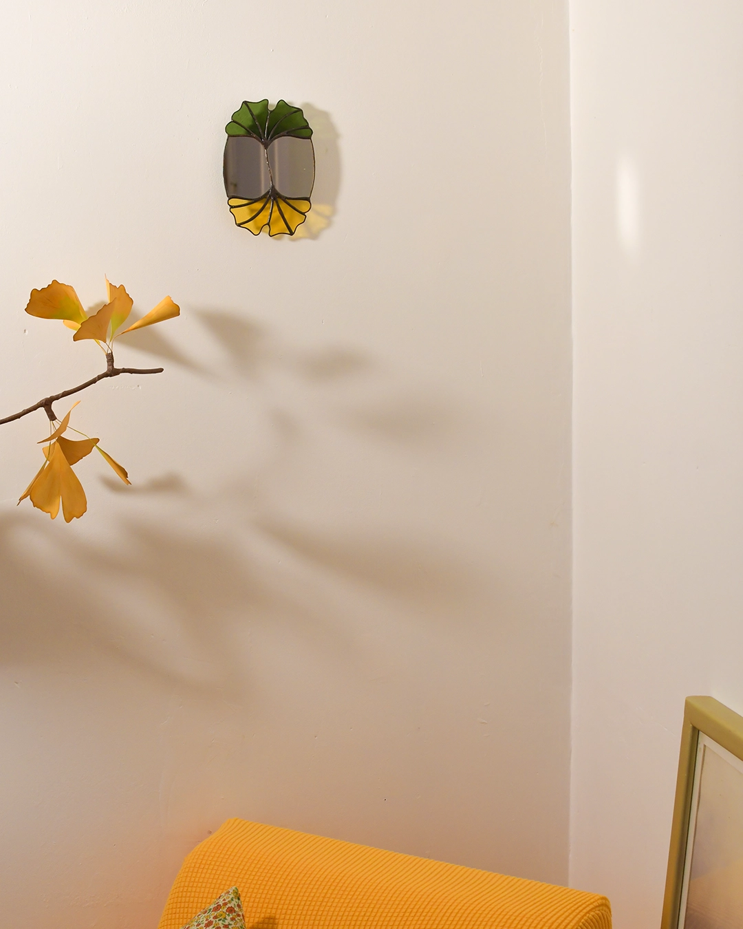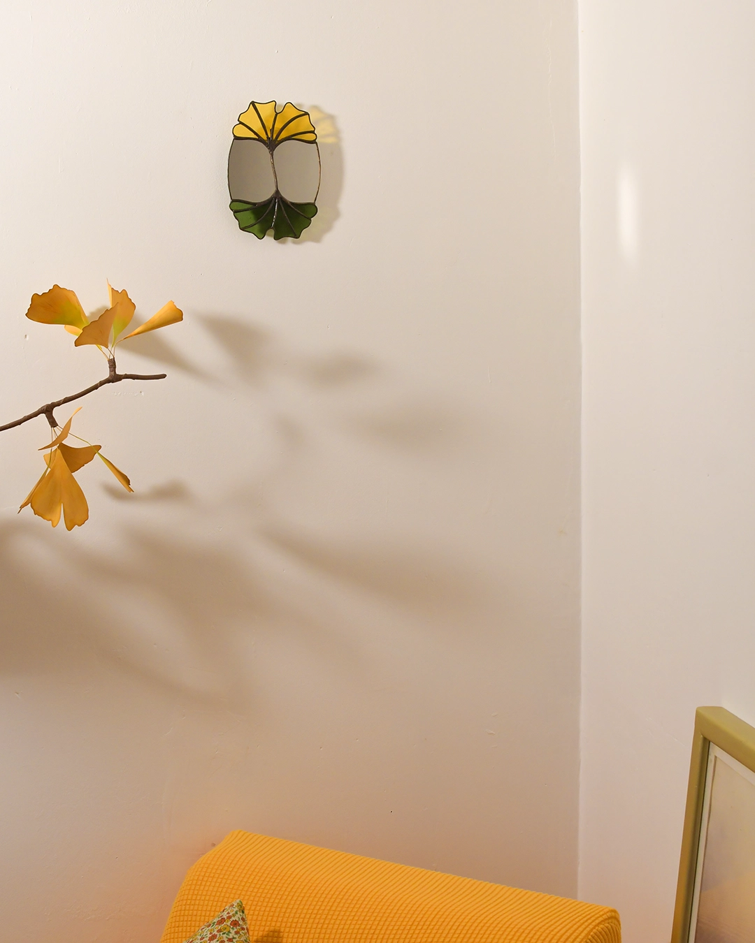 Le vitrail m’a inspiré une illustration en aquarelle autour du Ginkgo Biloba qui est fournie avec ce miroir comme une extension du thème.