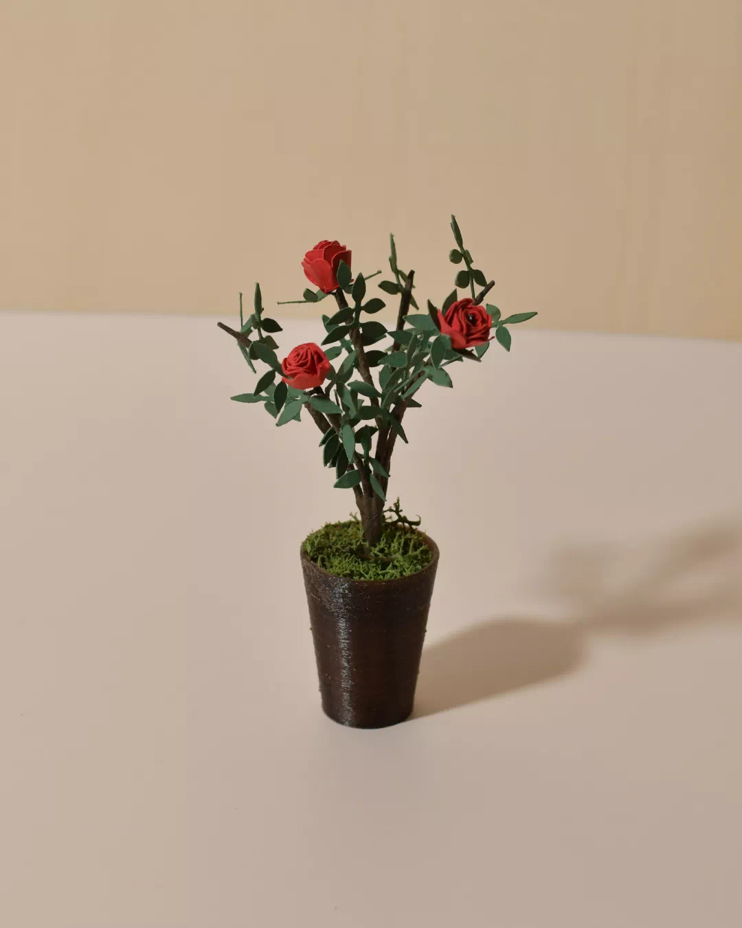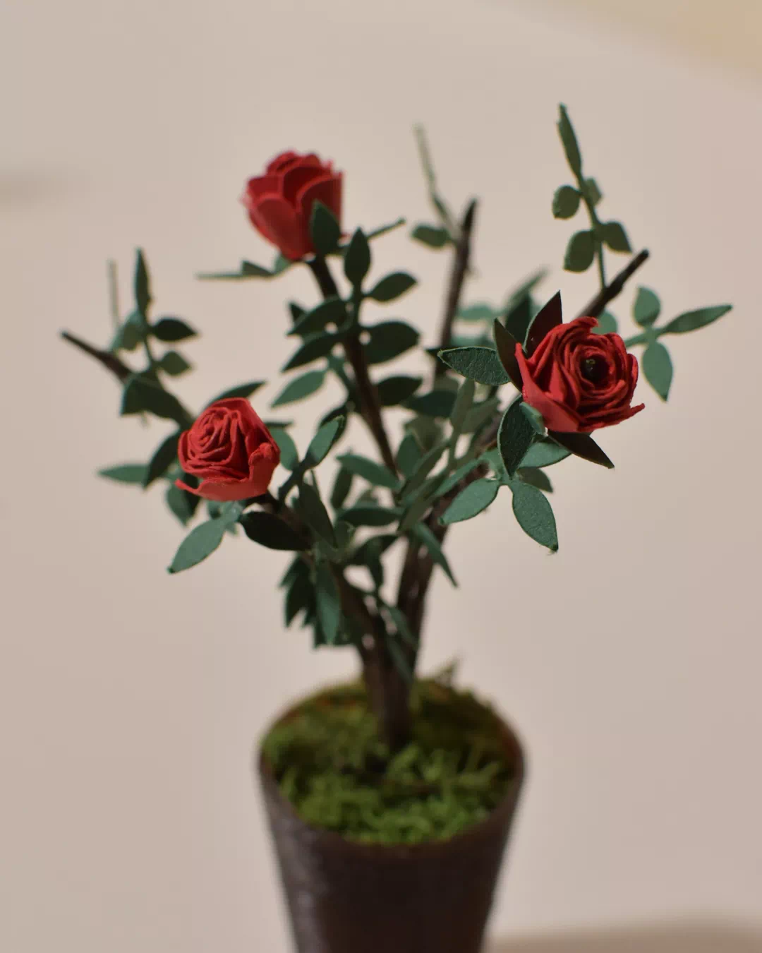 Petit rosier rouge en papier réalisé à la main, pensé comme un fragment de jardin à poser.