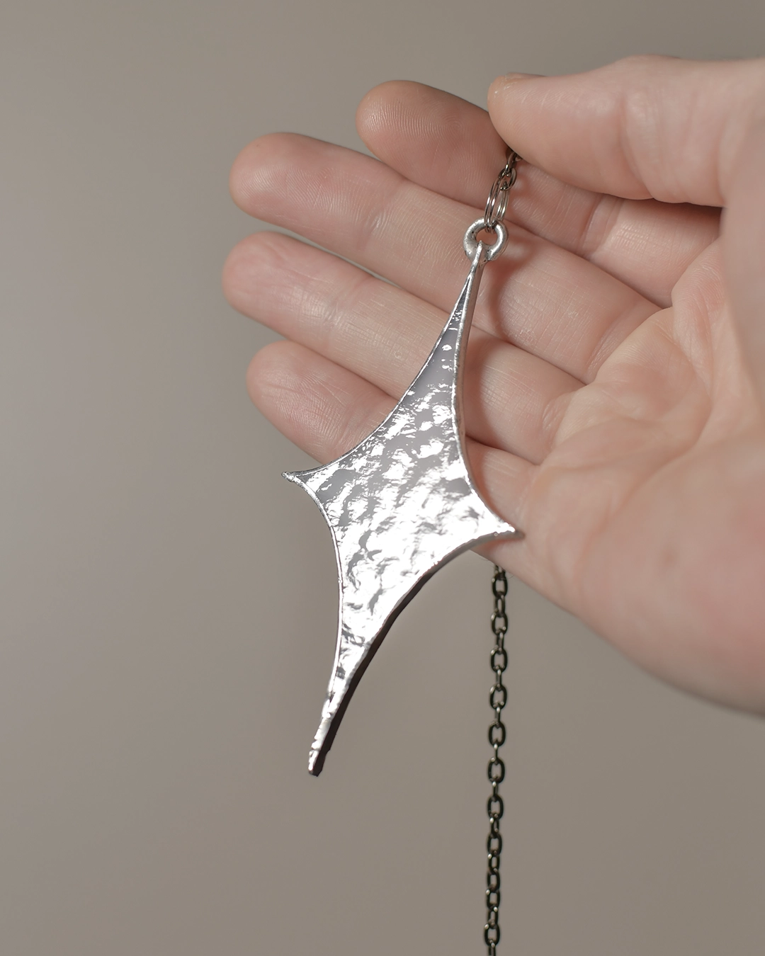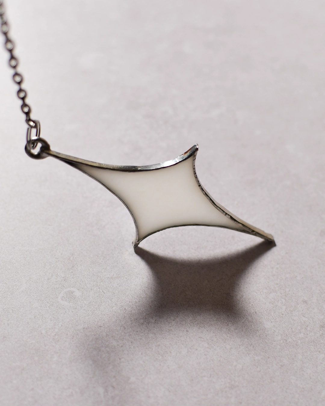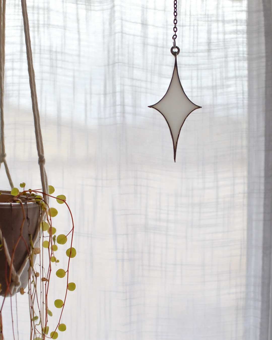 Le verre blanc opalescent de l’étoile laisse apparaître sa texture ondulée au gré des reflets lumineux, ou lorsqu’elle est baignée par la lumière du jour. Sa forme singulière, aux courbes tendues et aux pointes majestueuses, diffuse une lumière douce et apporte toute la magie de l’espace au cœur de la maison.