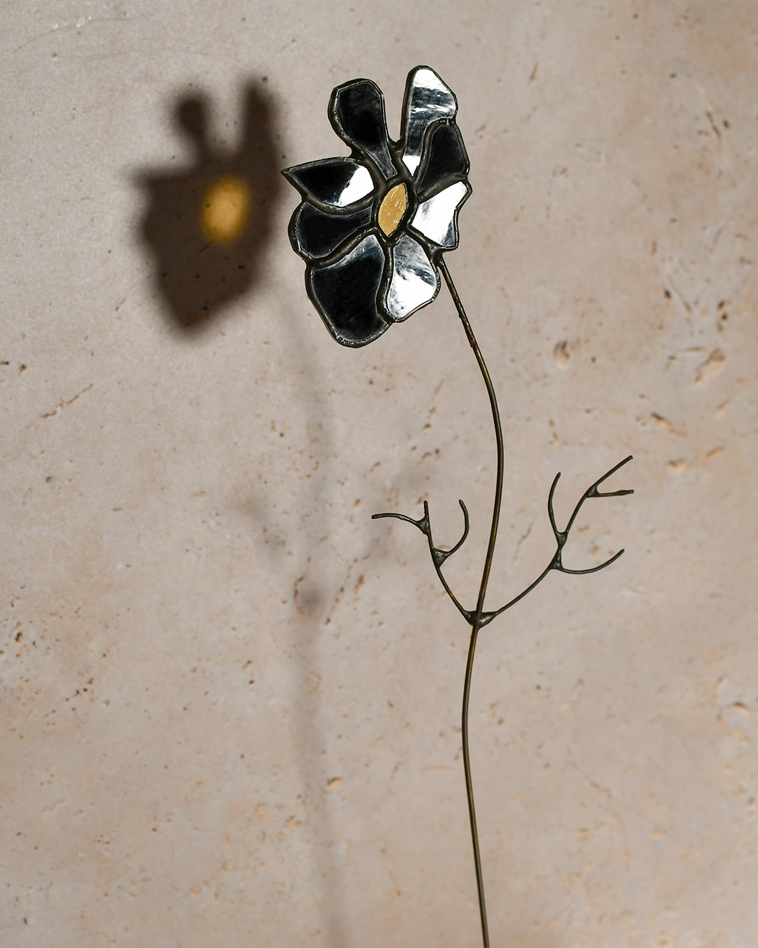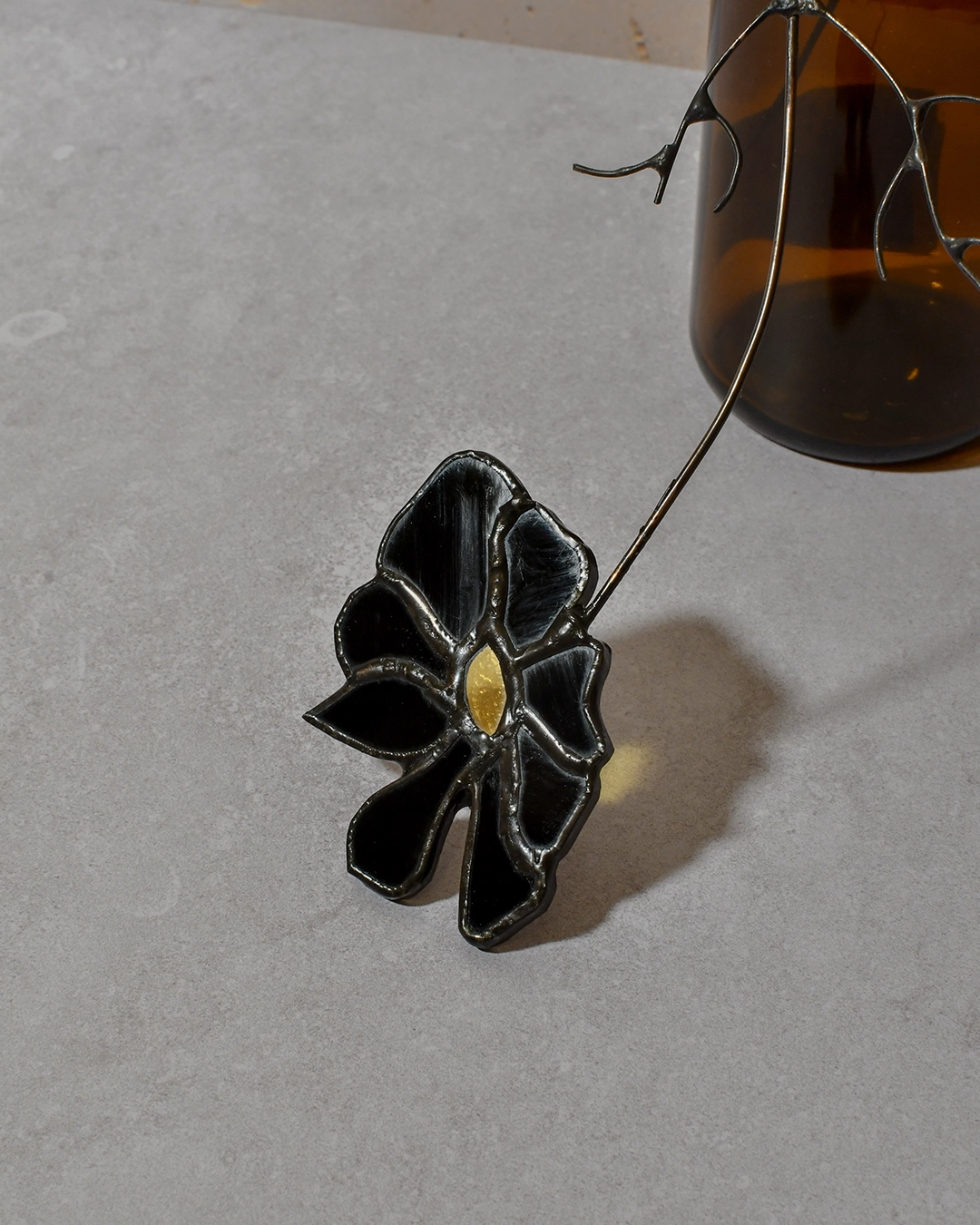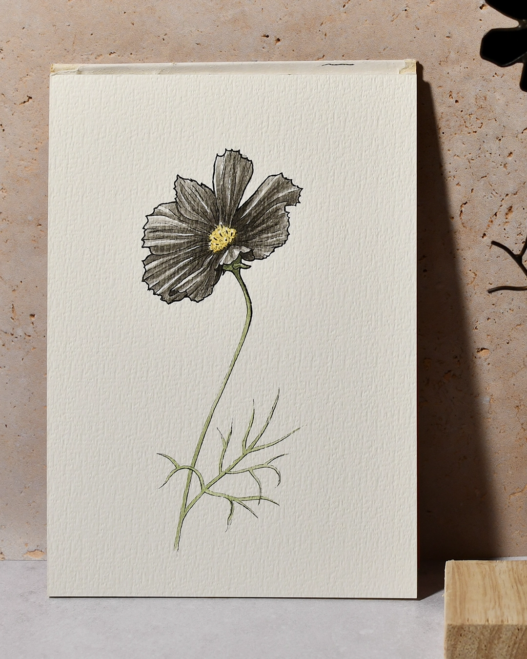Un Cosmos revisité dans une version noire et opaque. Pour prolonger l’expérience, la fleur en vitrail est accompagné d’une illustration à l’aquarelle. Cette illustration originale m’a servie comme référence et inspiration.