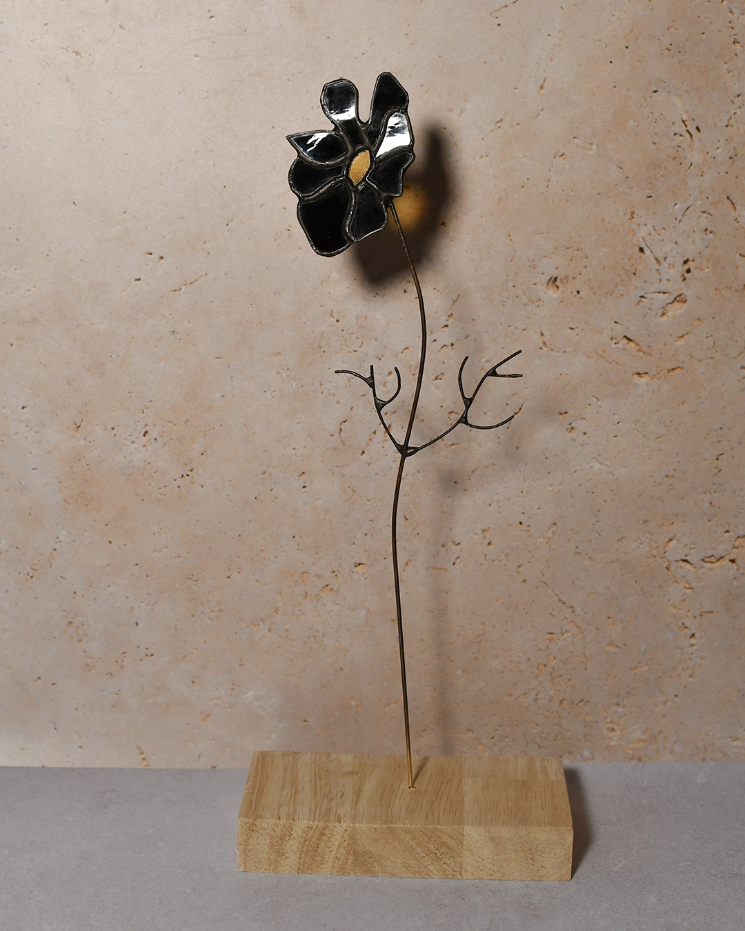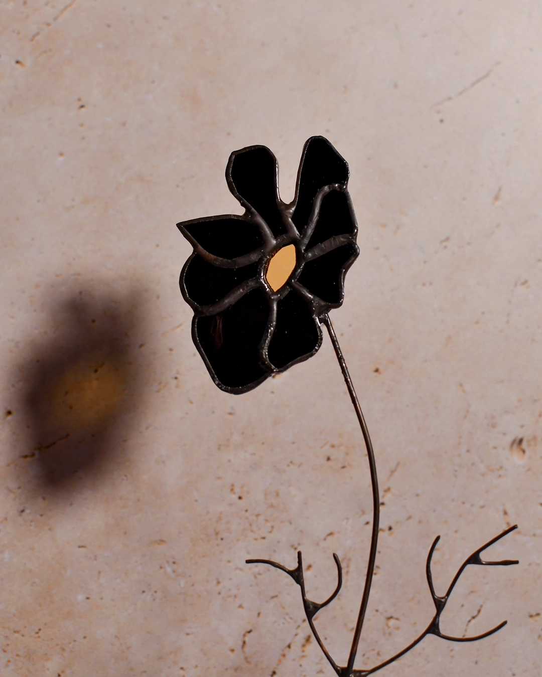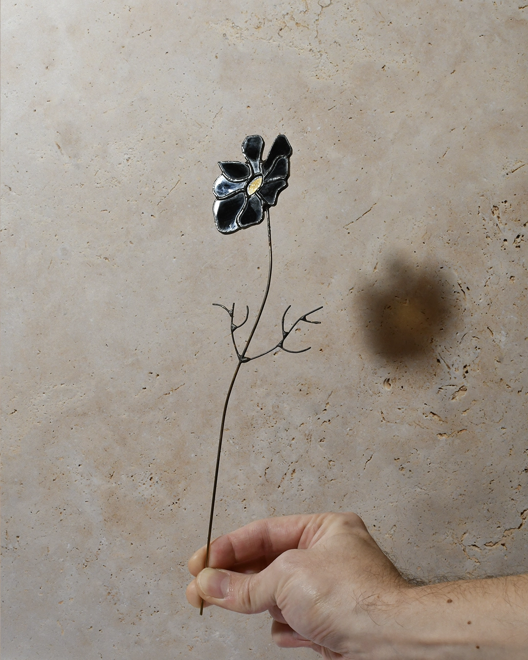 Le Cosmos est l’une des fleurs préférées de Solnaë. Ses pétales dansants et délicats se déclinent ici dans un noir profond, créant une silhouette sculptée par la lumière. Seul son cœur jaune, légèrement transparent, perce la noirceur pour révéler sa luminosité.