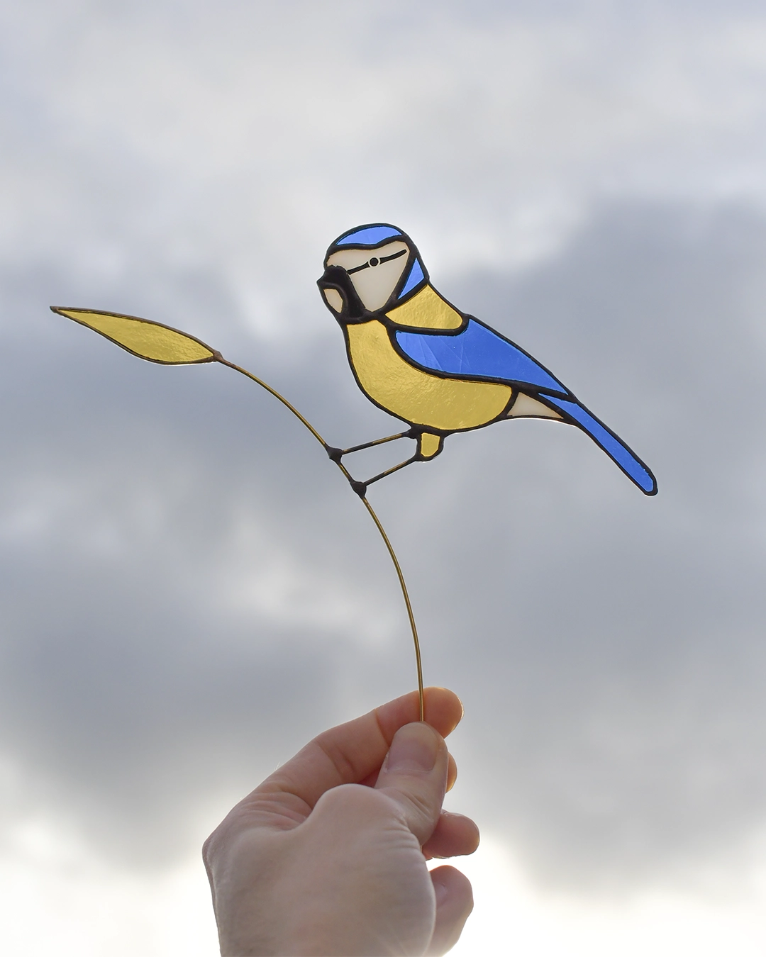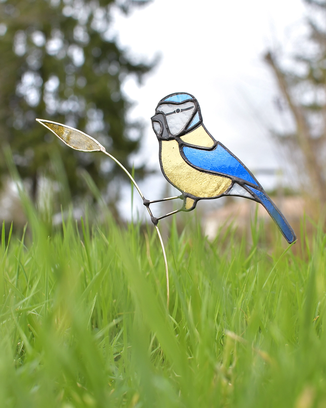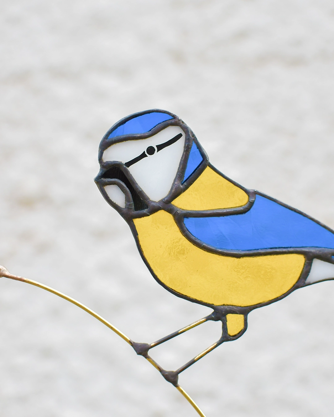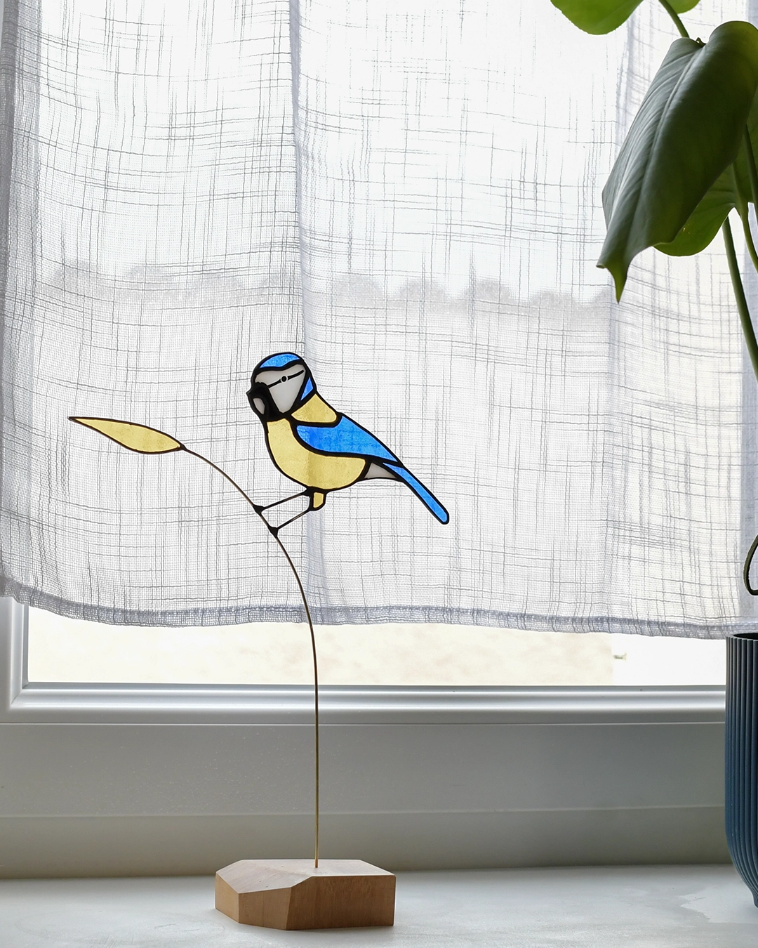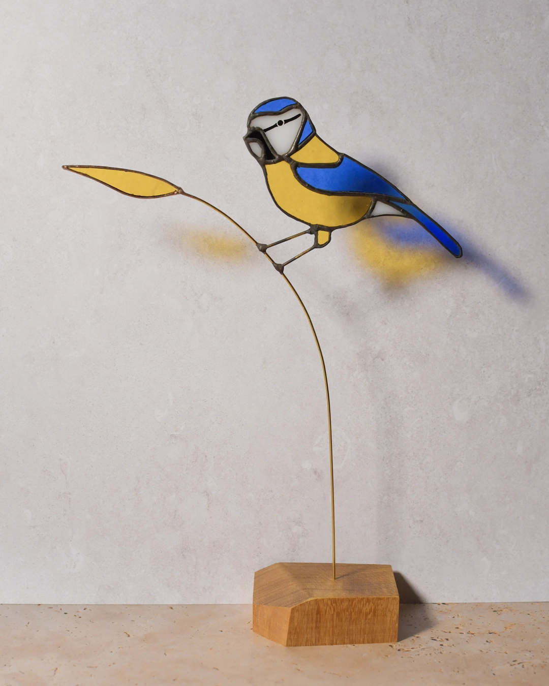 Sculpture artisanale de mésange bleue en vitrail Tiffany, délicatement façonnée à la main et posée sur son socle.